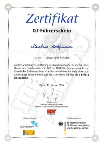 Marc Kiss" alias (Markus Hoffmann) hat am 11. Januar 2006 in Hagen an der Fortbildungsveranstaltung des Bundes- verbandes deutscher Discotheken und Tanzbetriebe e.V. BDT im DEHOGA Bundesverband) zum Erwerb des DJ - Führerscheins (Sachkundennachweis für Discjockeys zum Lärmschutz) teilgenommen und die schriftliche Prüfung mit Erfolg bestanden.